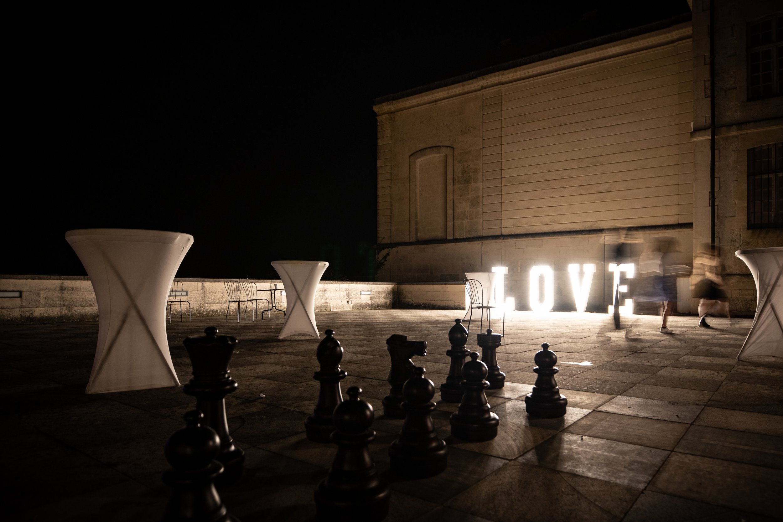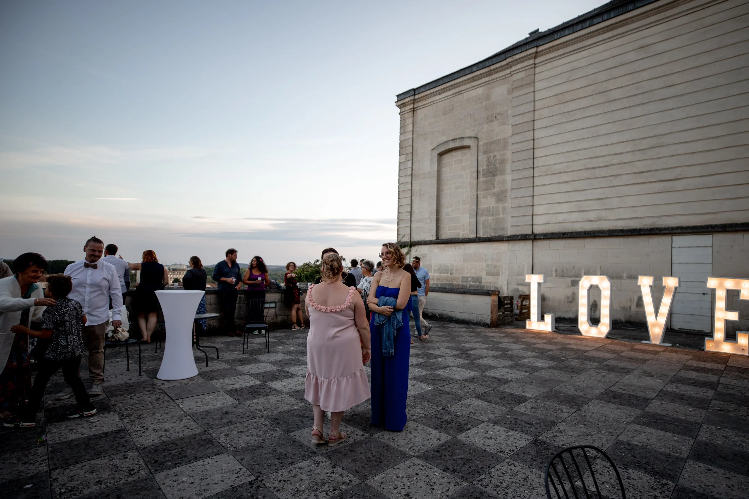 Entre lumière de fin de journée, vue dégagée et ambiance détendue, les invités ont profité d’un moment suspendu. Les grandes lettres lumineuses “LOVE” apportaient une touche visuelle forte — simple mais ultra efficace pour les photos et l’ambiance.