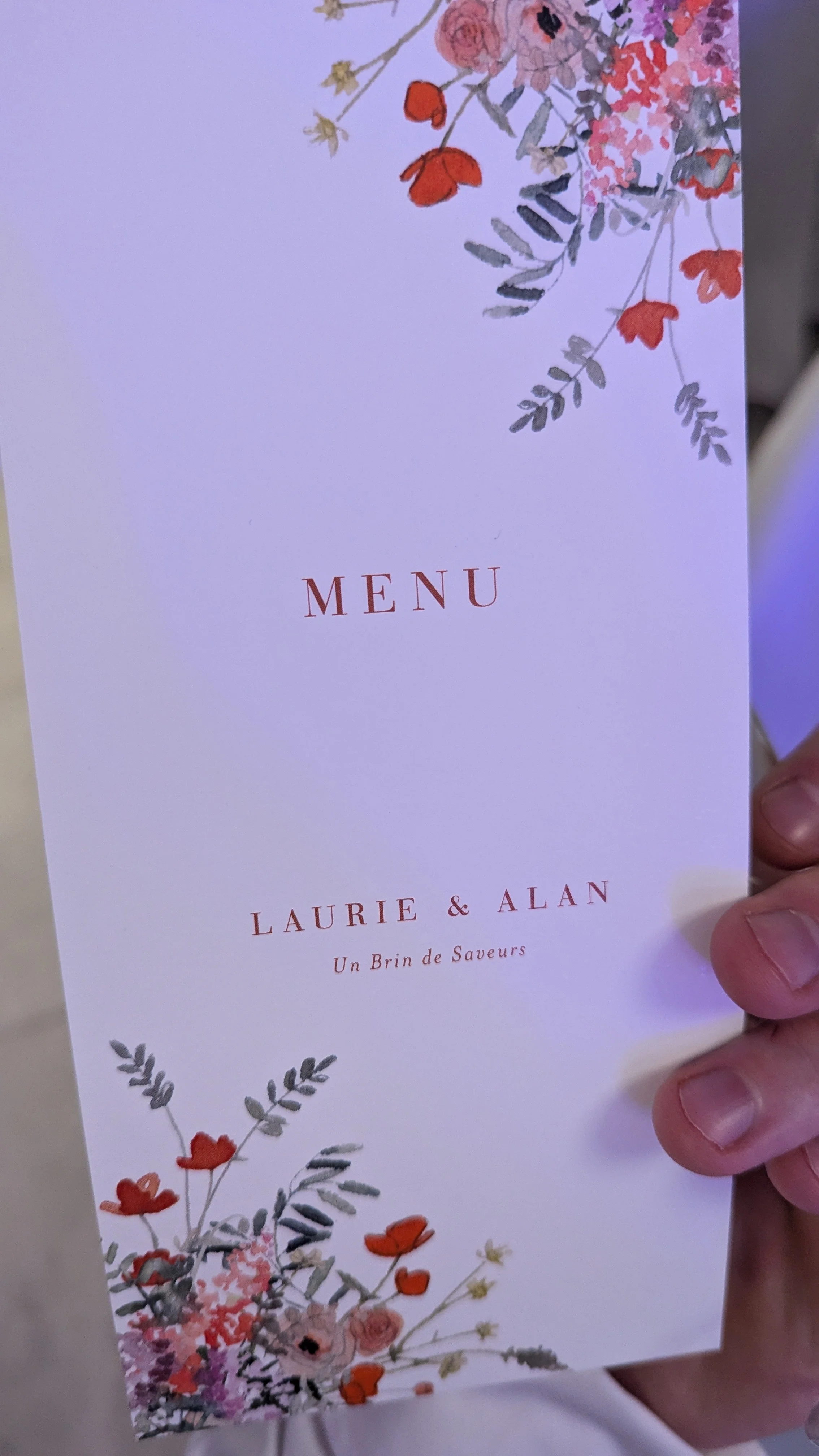 Le menu donne le ton : typographie fine, illustrations florales délicates, tons corail parfaitement maîtrisés. C’est simple mais efficace — et surtout cohérent.